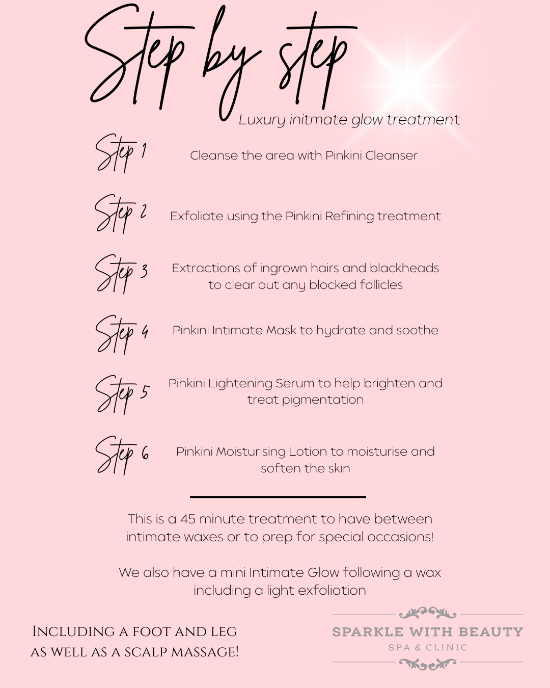 We also offer a luxury Intimate glow to have in between wax treatments. which includes extraction of ingrowing hairs and to help with pigmentation